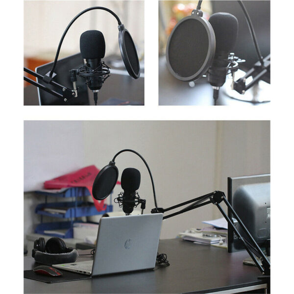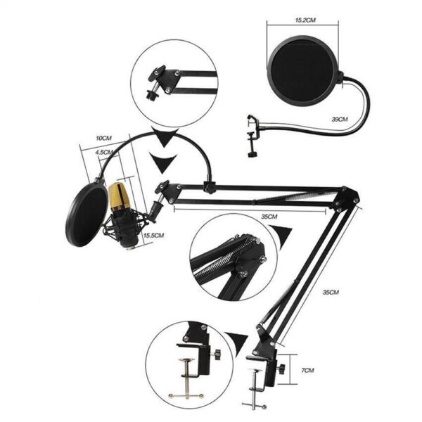Универсален студиен микрофон, комплект със стойка за бюро, кабел (XRL – 3.5 mm), държач, поп-филтър, предпазен дунапрен.