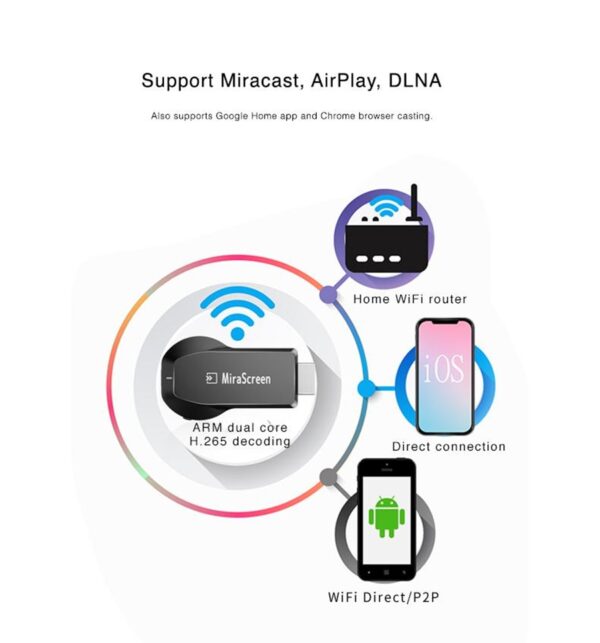 С помощта на този приемник Медия плейър AnyCast M9 Plus, двуядрен, 2 Core, CPU Corex A9 1.2 Ghz, DLNA, AirPlay, Miracast, Cloud, RAM 128MB, HDMI може да прехвърляте безжично информации от телефон, таблет, лаптоп( включително приложения, презентации, интернет навигация, уеб сайтове и др.), видео прожектори и др. съвместими усторйства.