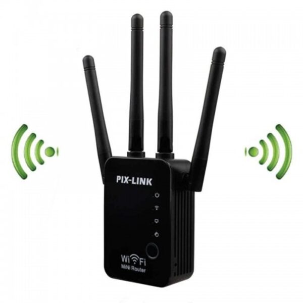 Усилвател за Wi-Fi мрежа PIX-LINK, Модел LV-WR16, 300mbps, 2 LAN Port, Повторител, Рипийтър, Ретранслатор, 4 антени, Черен